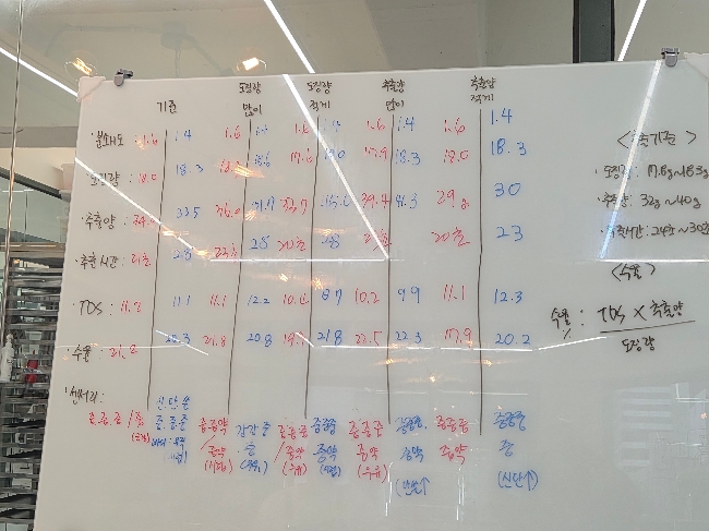 오늘은 TDS/수율 2번째 수업으로 분쇄도 변경과 결과값 확인할수있어 좋았어요